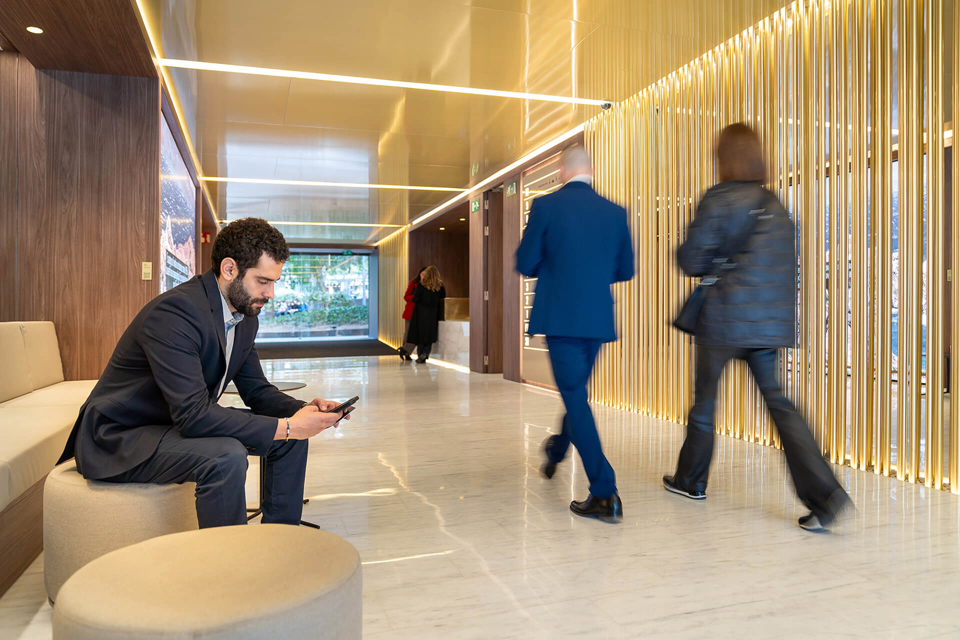 The modern reception area offers comfortable spaces designed for informal meetings or quick visits.
